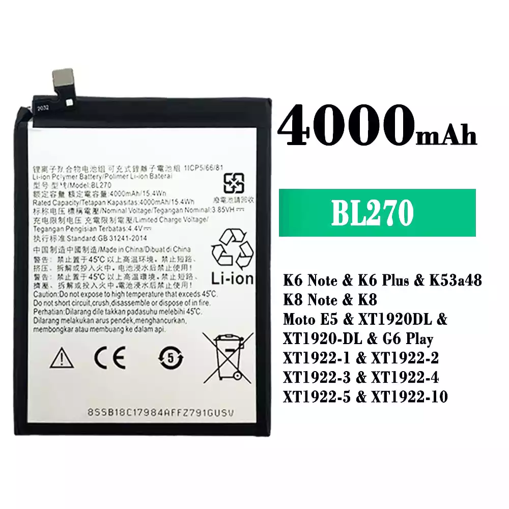 Battery BL270 for Lenovo K6 Note / K6 Plus / K53a48 / K8 Note / K8 / Moto E5 / XT1920DL / XT1920-DL / G6 Play / XT1922-1 / XT1922-2 / XT1922-3 / XT1922-4 / XT1922-5 / XT1922-10